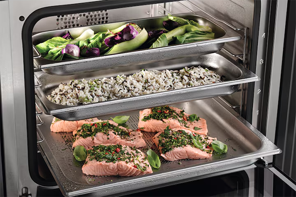 Приготовление до 3 блюд одновременно (рыба, гарнир, овощи) с автоматическим подбором режима.